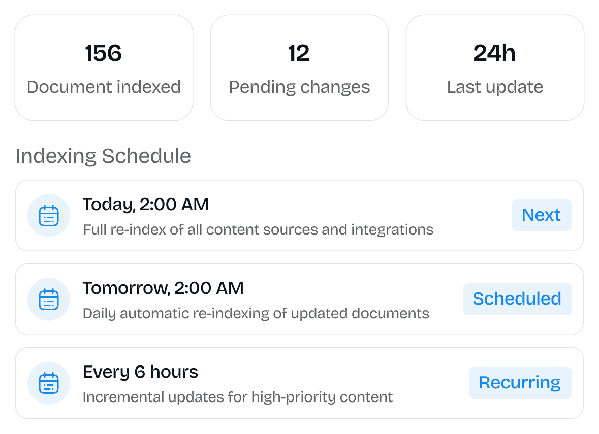 Search indexes build automatically and stay synchronized with source content. Updates appear in search results within minutes.
