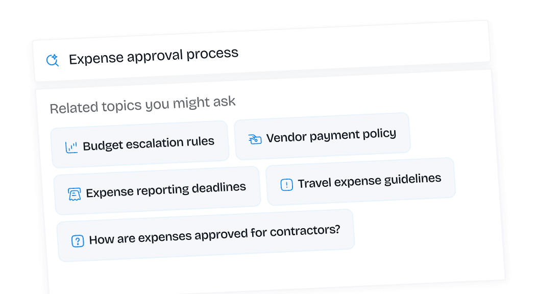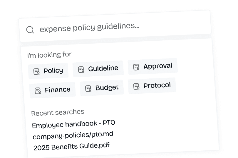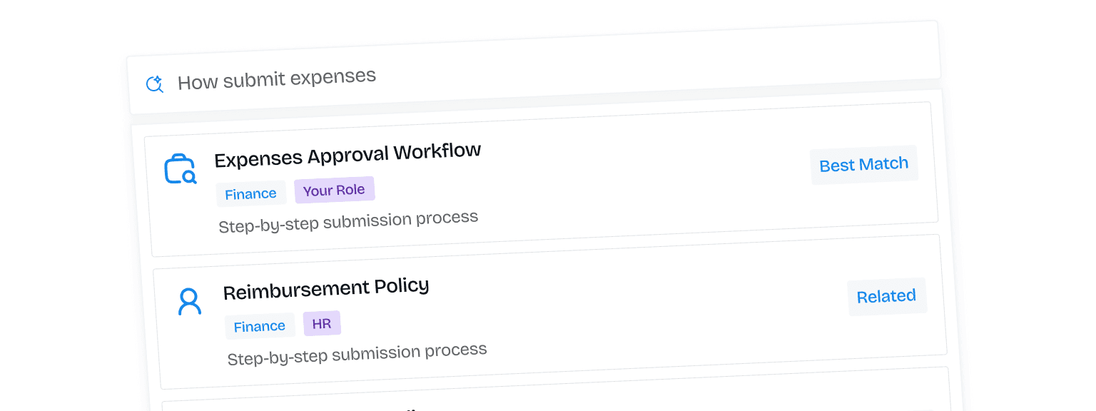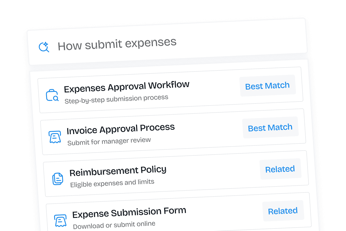 The AI understands what you're looking for. Searching "how to submit expenses" surfaces approval workflows, reimbursement policies, and submission forms automatically.