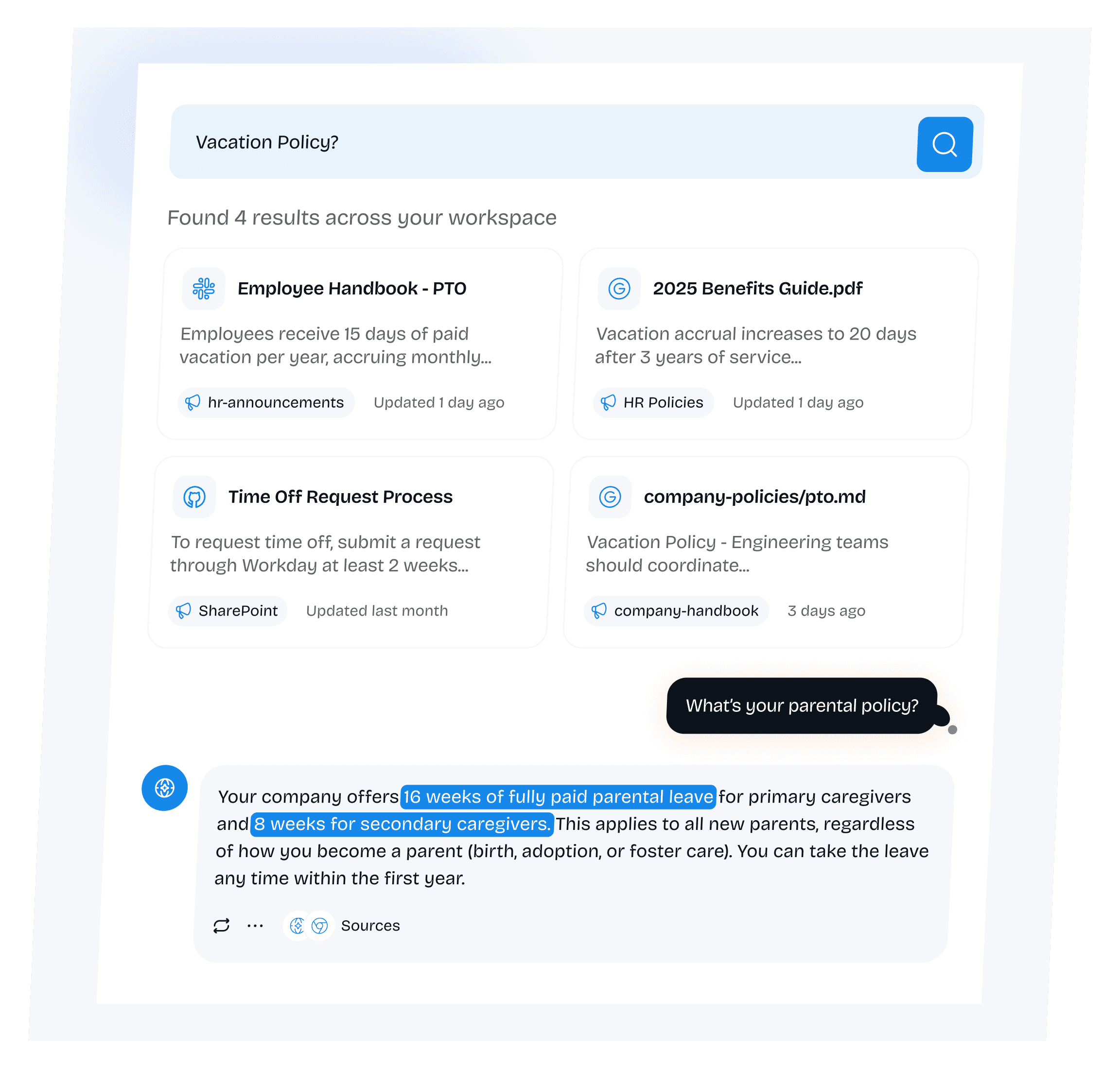 One search interface for all organizational knowledge. No more checking five different platforms to find information.