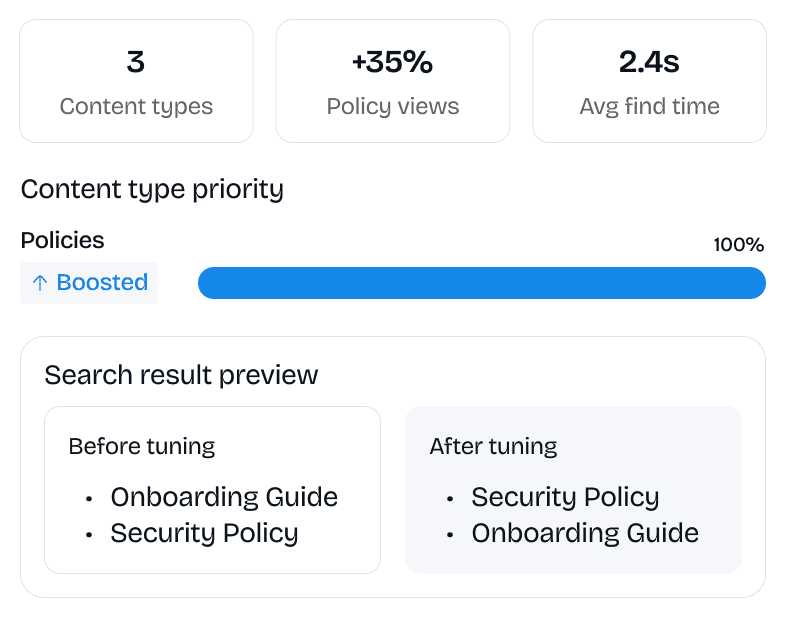 Adjust search ranking algorithms to match organizational priorities. Boost certain document types or sources in results.