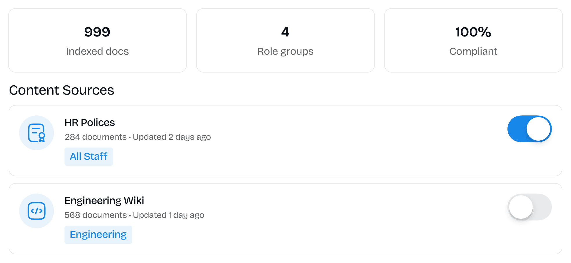 Granular controls over who can search which content repositories. Restrict search access to specific teams or roles.