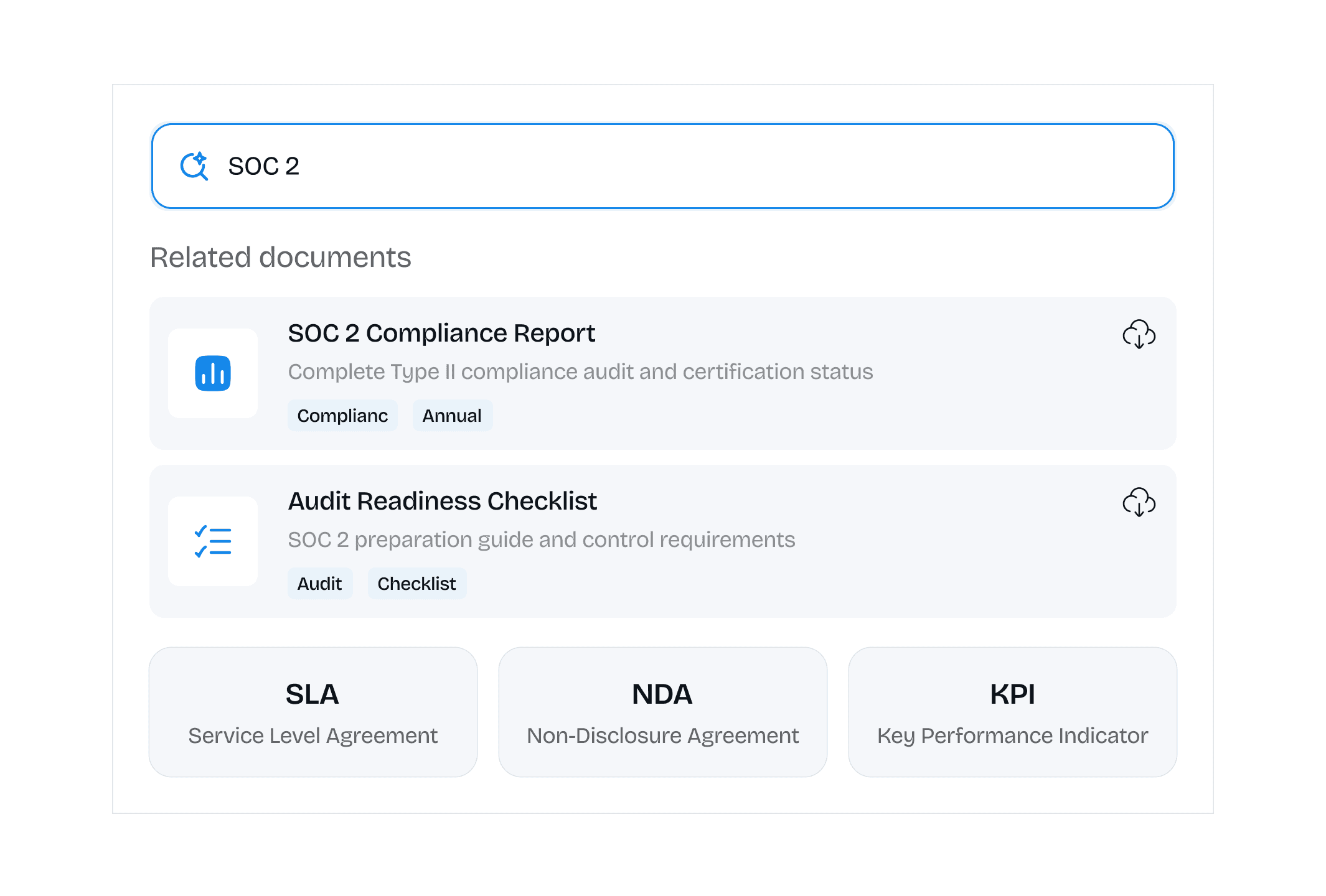 The system recognizes organizational acronyms and expands them appropriately. Searching "SOC 2" finds "Service Organization Control 2" documentation.
