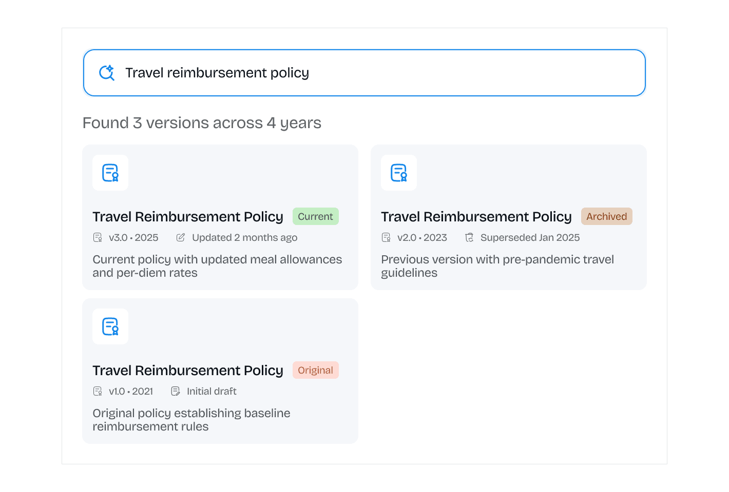 Access previous versions of documents through search. Find how policies or procedures existed at specific points in time.