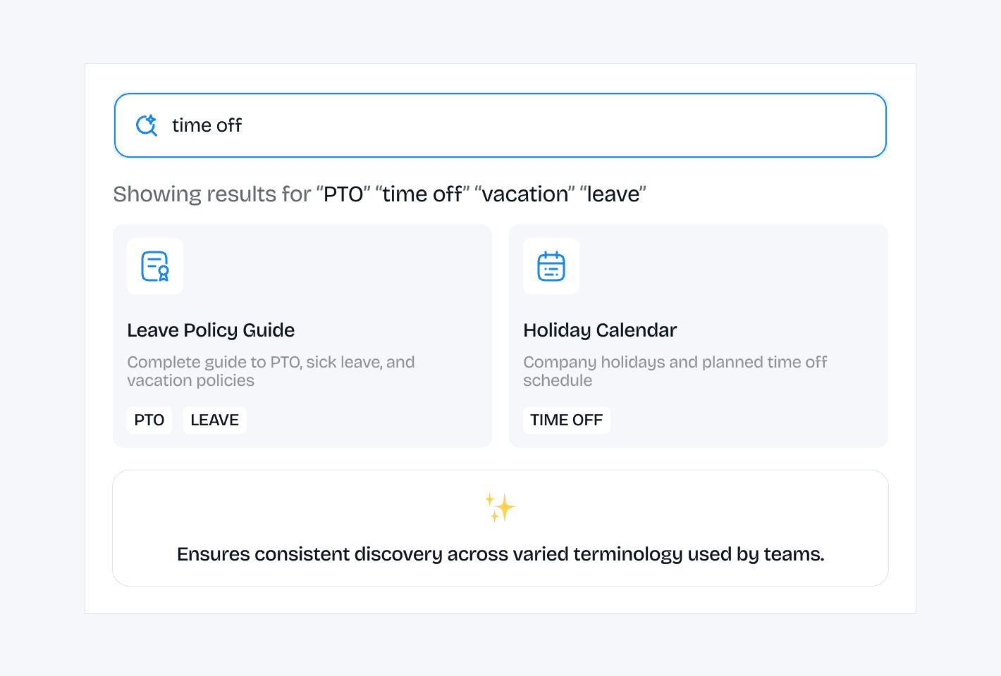 Search terms are matched against synonyms and related concepts. "Time off" returns results for "PTO," "vacation," and "leave."
