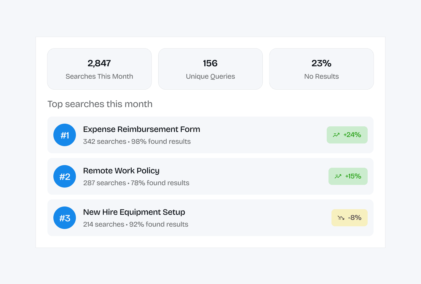 Track most common search queries across the organization. Understand what information teams need most frequently.