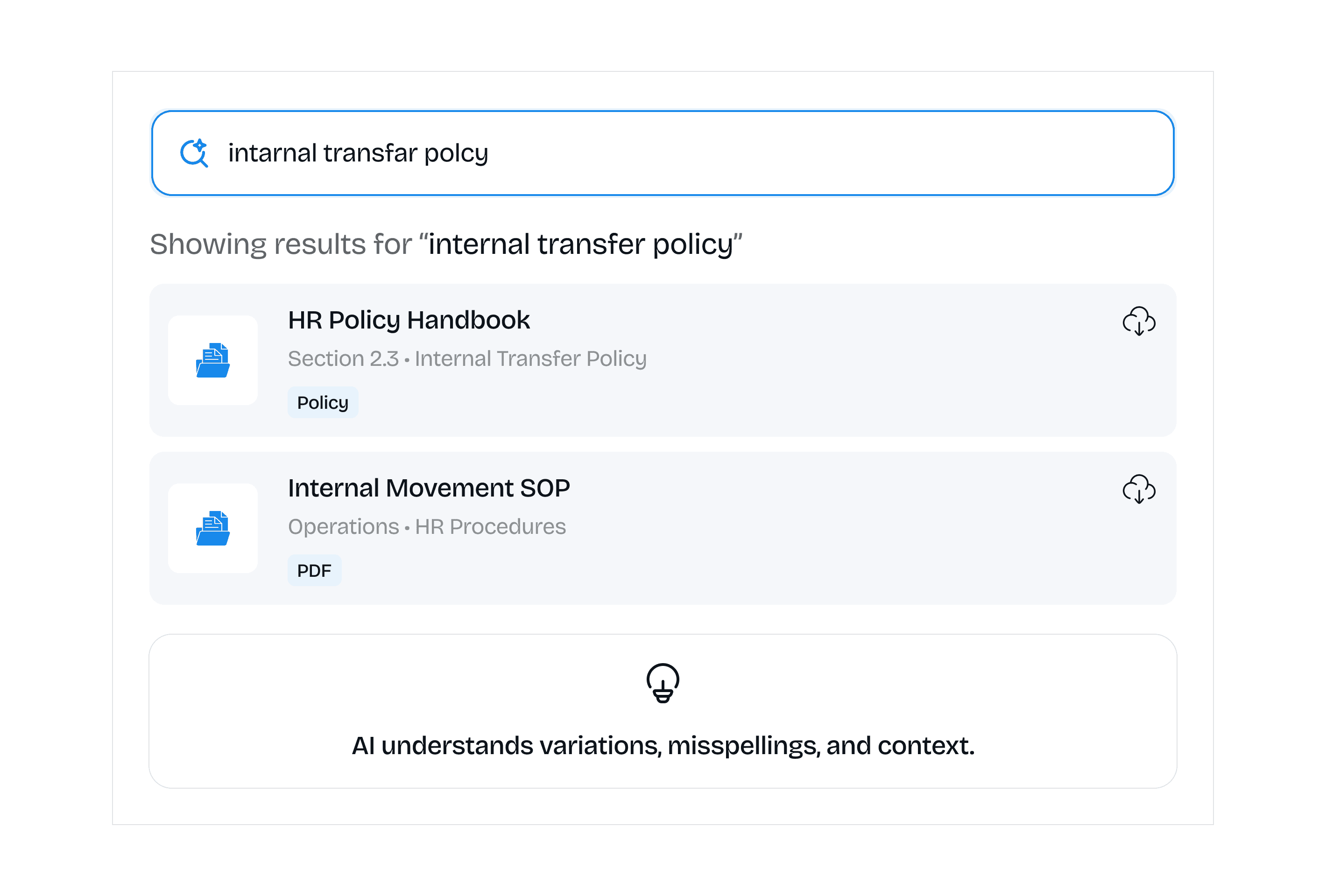 New employees get instant answers to onboarding questions without interrupting team members. Search surfaces required training, setup guides, and department-specific resources automatically. Reduces time-to-productivity and eliminates repetitive onboarding questions.