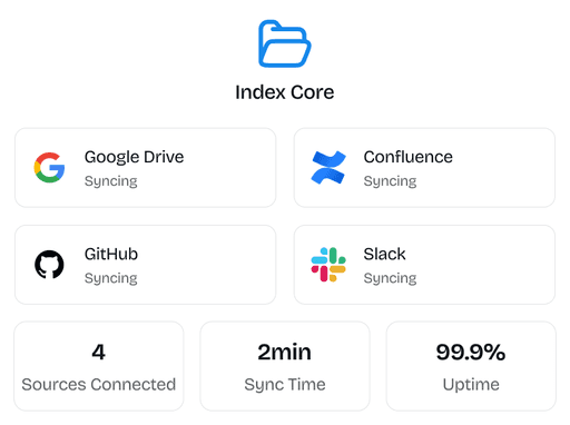 Engineering teams access technical documentation without leaving their workflow. Search understands technical terminology and finds relevant code samples, architecture docs, and runbooks. Reduces time spent searching Confluence, GitHub wikis, or Slack history.