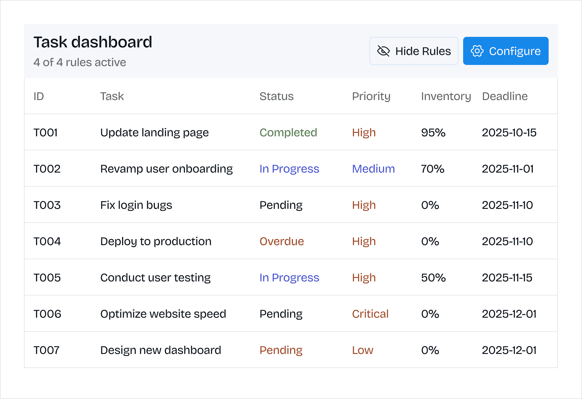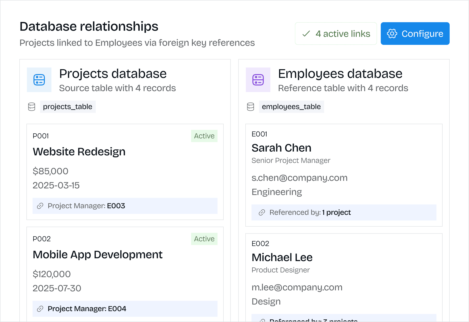 Build employee directories within HR documentation with contact information, departments, and roles. Vendor databases in procurement procedures showing contact details and contract information. Customer lists in sales documentation with account details and status. Emergency contact databases in safety procedures.
