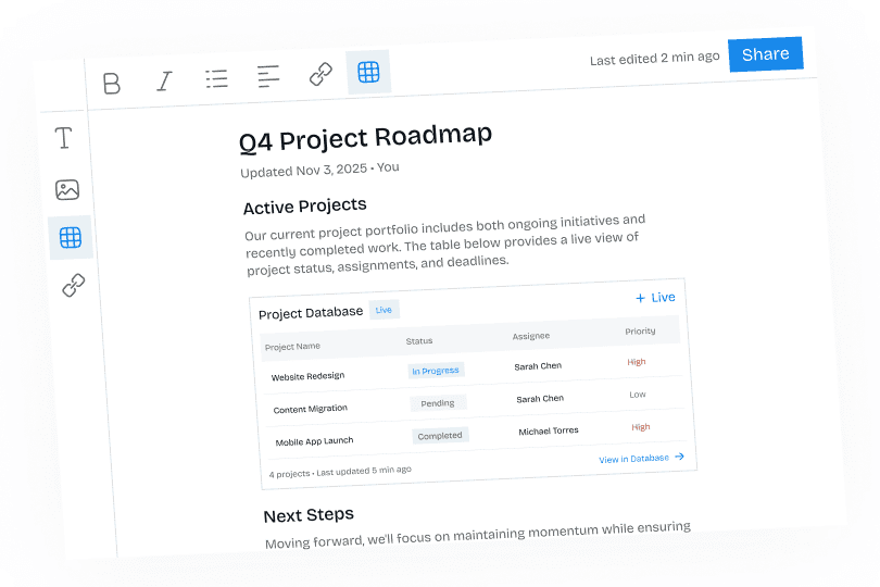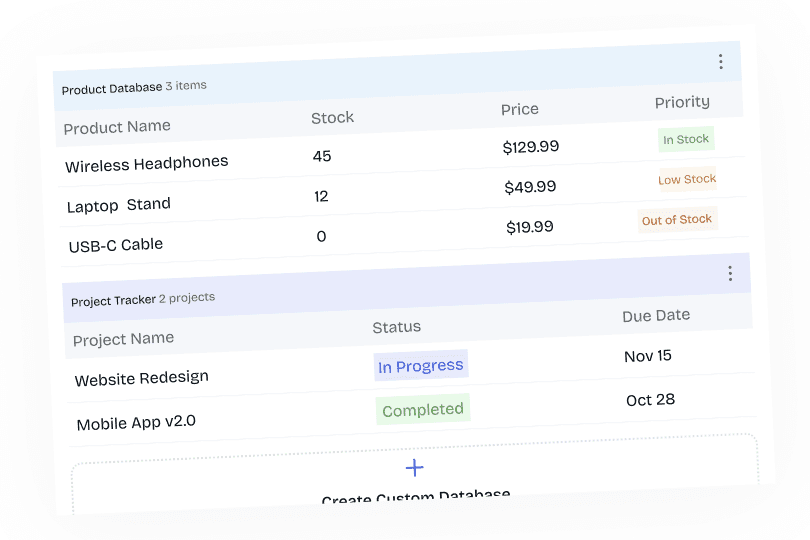 Build product catalogs with specifications, pricing, and availability inline with product descriptions. Feature comparison matrices showing capabilities across product tiers. Pricing tables with automatic discount calculations. SKU databases with current inventory levels. Compatibility charts showing which products work together.