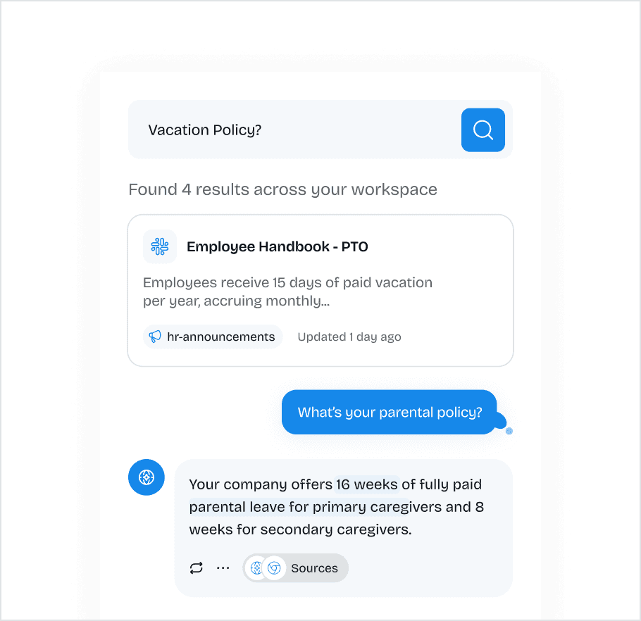 Natural language search and chatbot functionality connected to your entire knowledge base. Your team asks questions and gets instant answers pulled from your documentation.