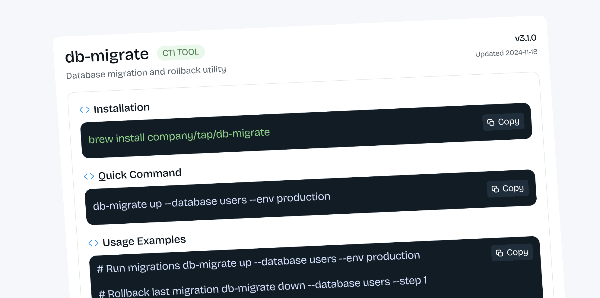 Maintain updated instructions for internal CLI tools, scripts, infrastructure templates, and more.