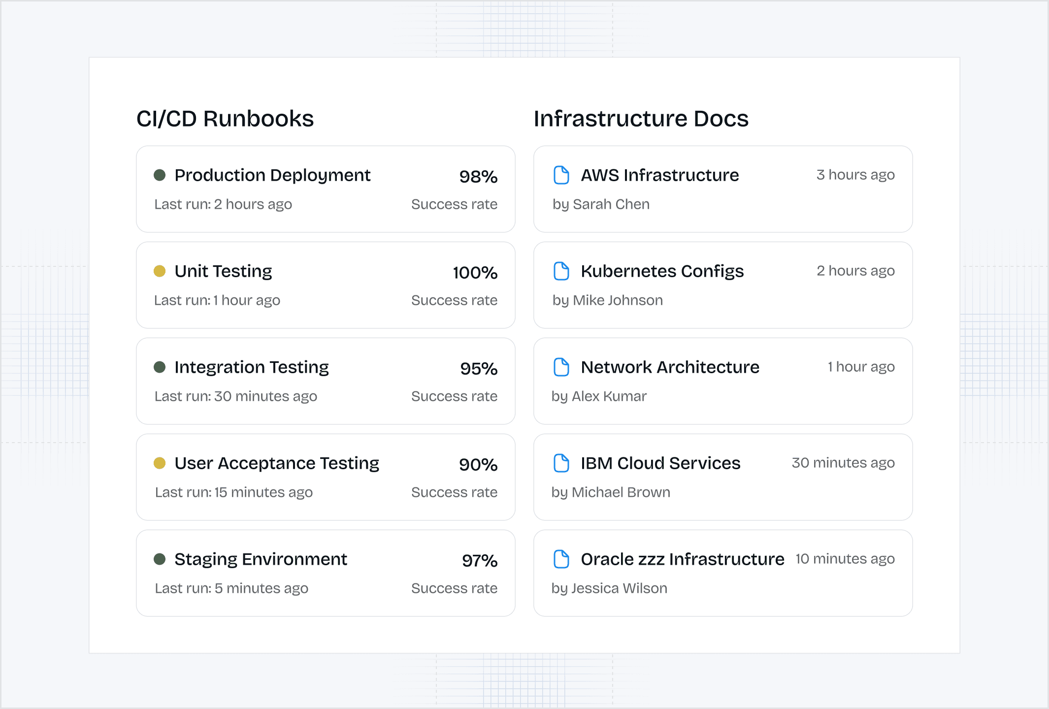 Organize runbooks, CI/CD flows, cloud configuration steps, and internal tooling docs in one place.